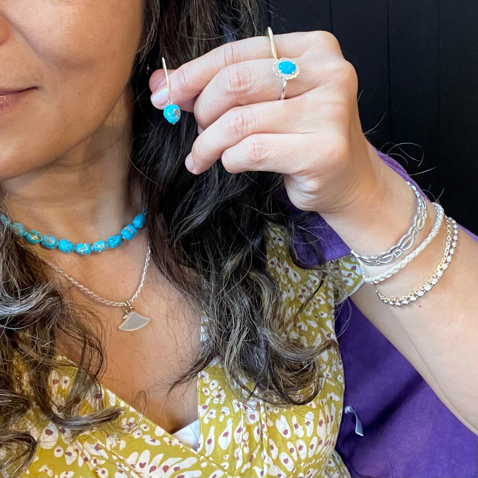 自然のままのターコイズのピアスです。ナチュラル(人工的な処理を一切していない)ソノランゴールドターコイズの中でも、黄鉄鉱がダルメシアン柄のようにふんだんに入ったとても珍しい石を使いました。