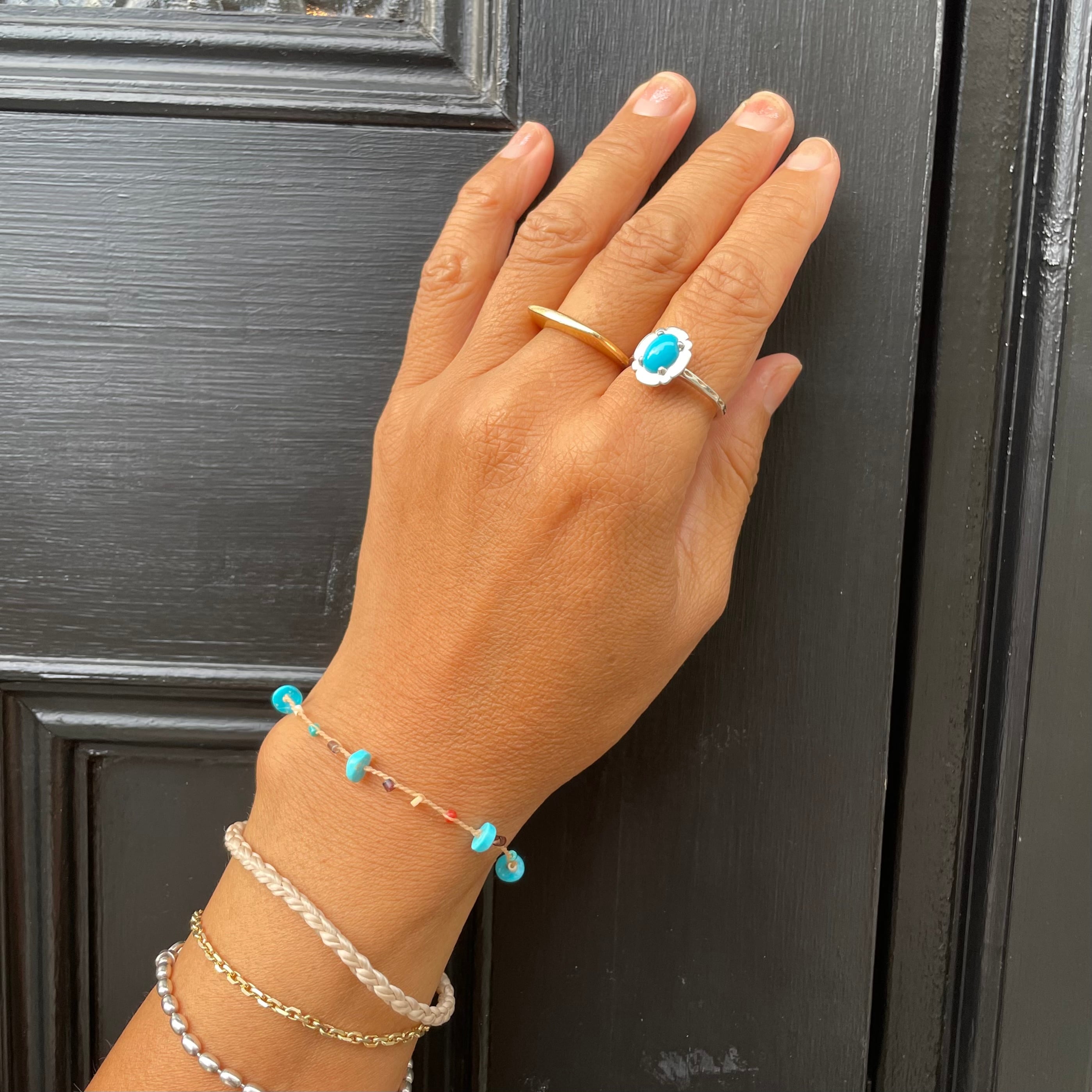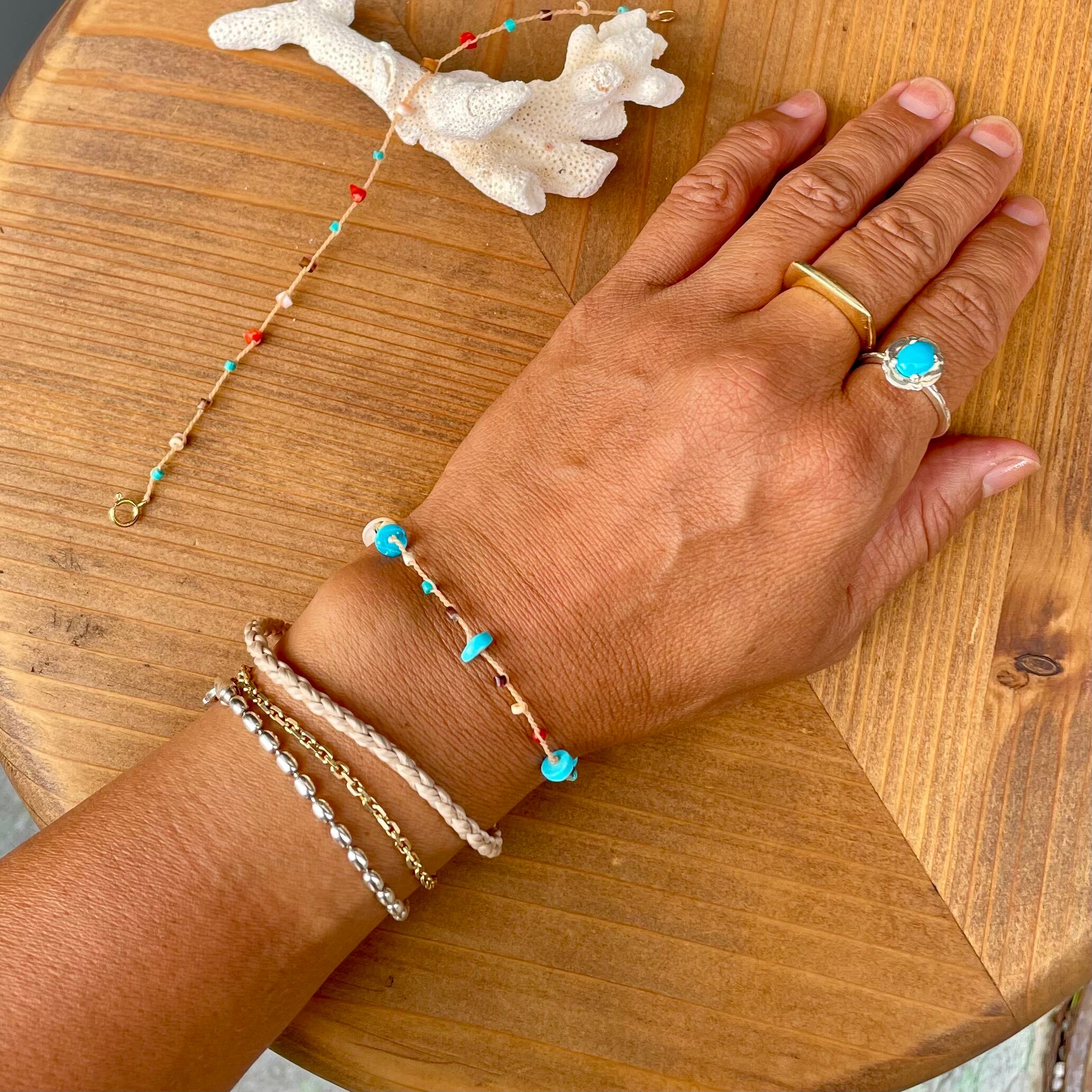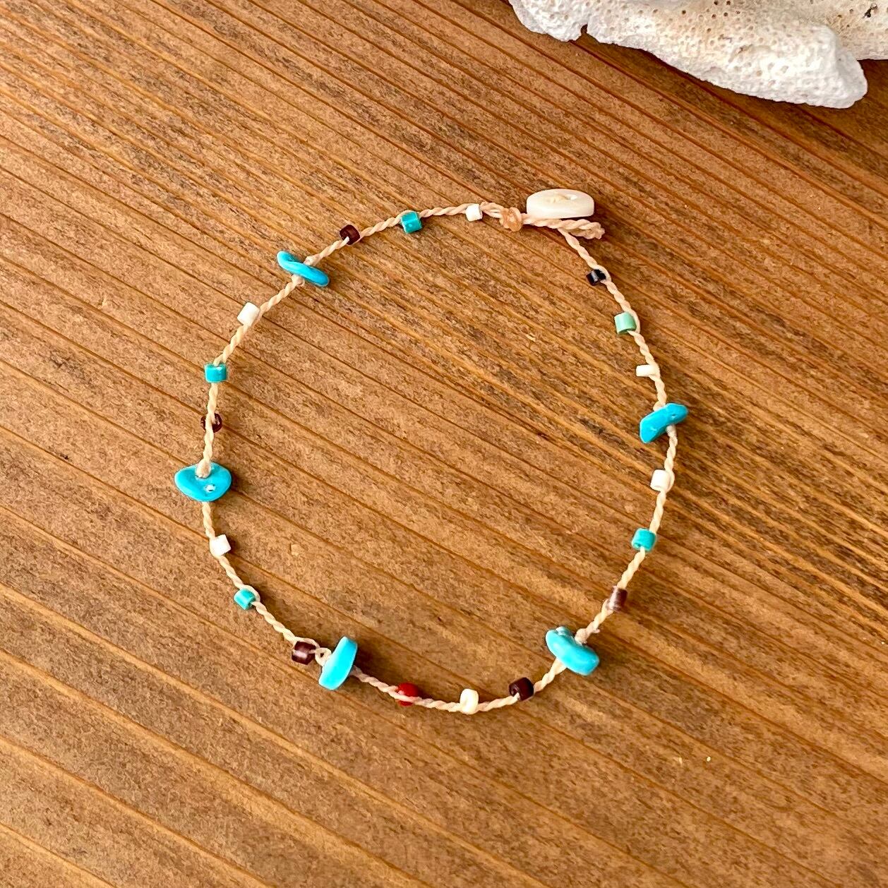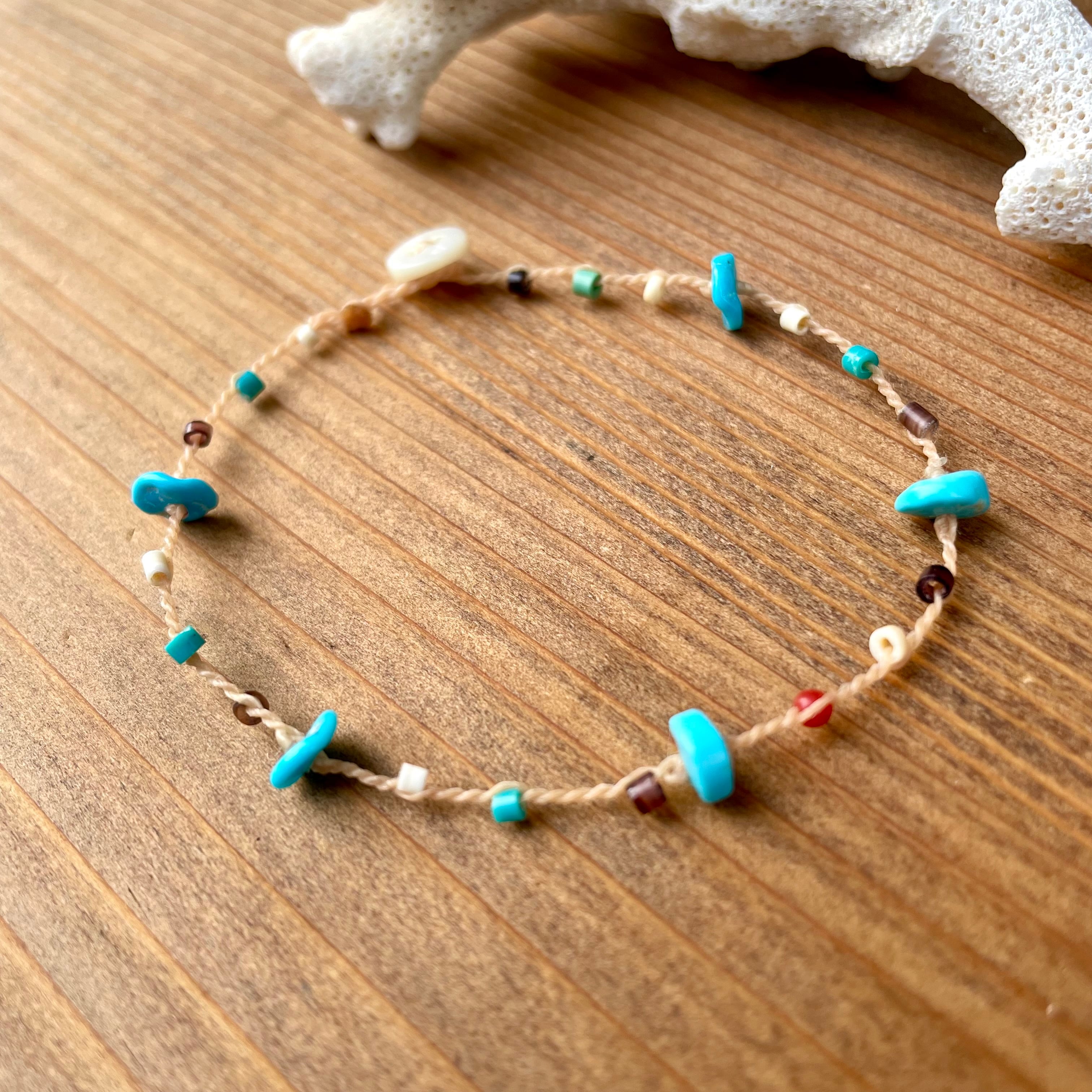 細いポリエステルワックスコードに天然石や珊瑚、貝のビーズを撚りこみブレスレットに仕立てました。繊細だけど丈夫な本体に自然な色を散りばめた、ボニーポート定番のスタイル♪ 綺麗な色のソノランゴールドターコイズがとても目立ちます。その他地中海珊瑚、茶の貝、白い貝を使用しています。 付けっぱなしのご使用をお考えの方には、天然素材の艶がなくなる可能性をご考慮ください。 サイズ:17.5cm