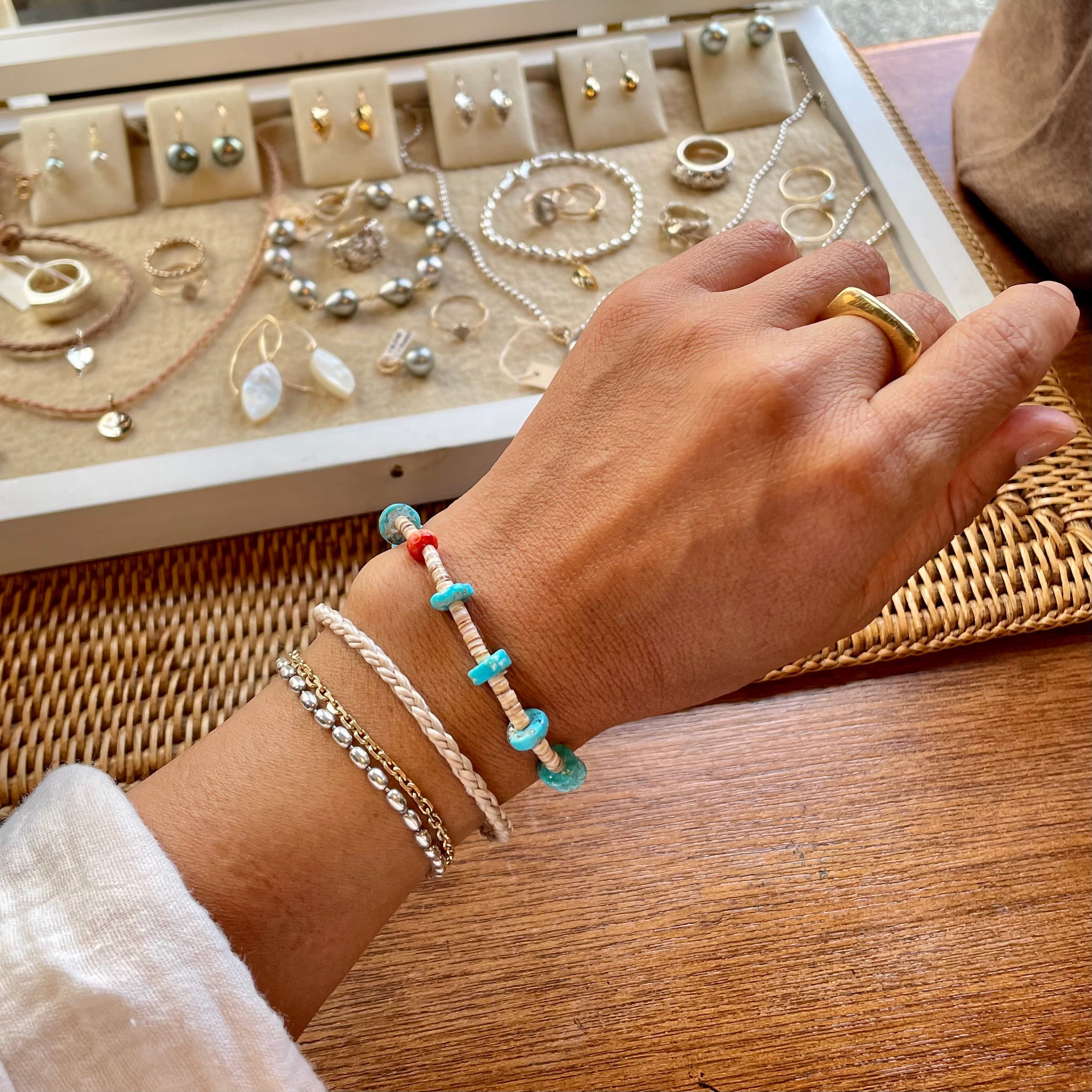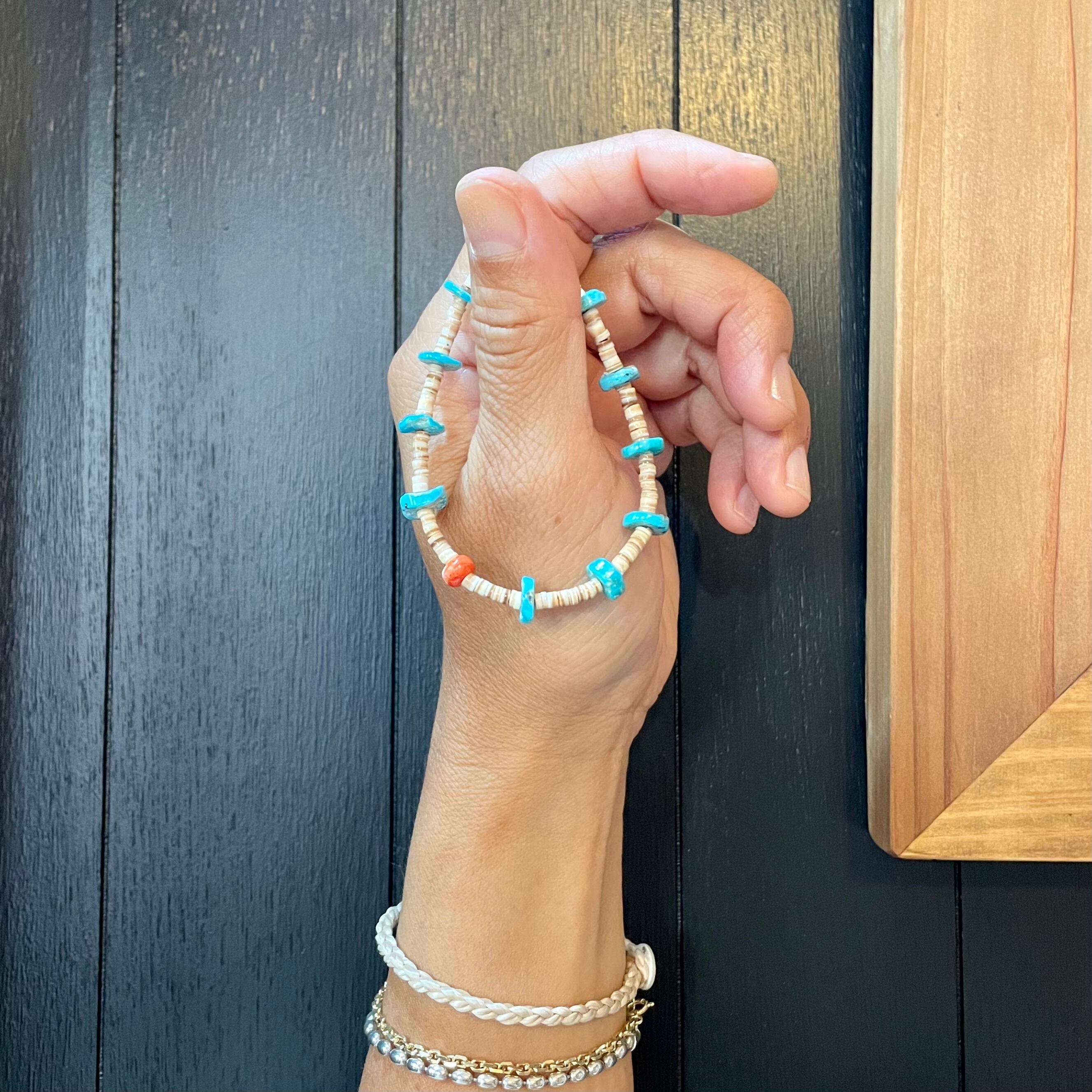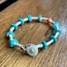 ナチュラルなソノランゴールドターコイズが映えるブレスレットができました。 ターコイズは身につけたいけどあまりボリューミーなのは苦手・・・という方にもつけやすいシェルビーズが多めの軽い着け心地です。完全ナチュラルな美しいターコイズの色が華やかなので一本でも存在感あり、また重ね付けにも重宝しそうなブレスレットです。 サイズ:17.5cm 使用素材:ソノランゴールドターコイズ,スパイニーオイスター,メロウシェルヘイシビーズ,高瀬貝ボタン,ポリエステルコード