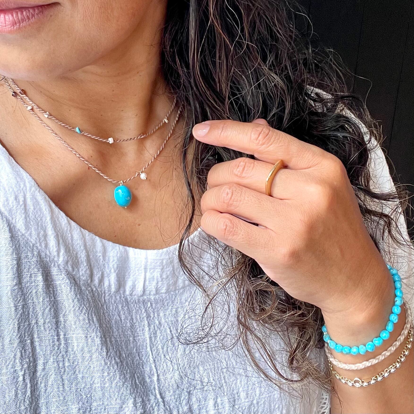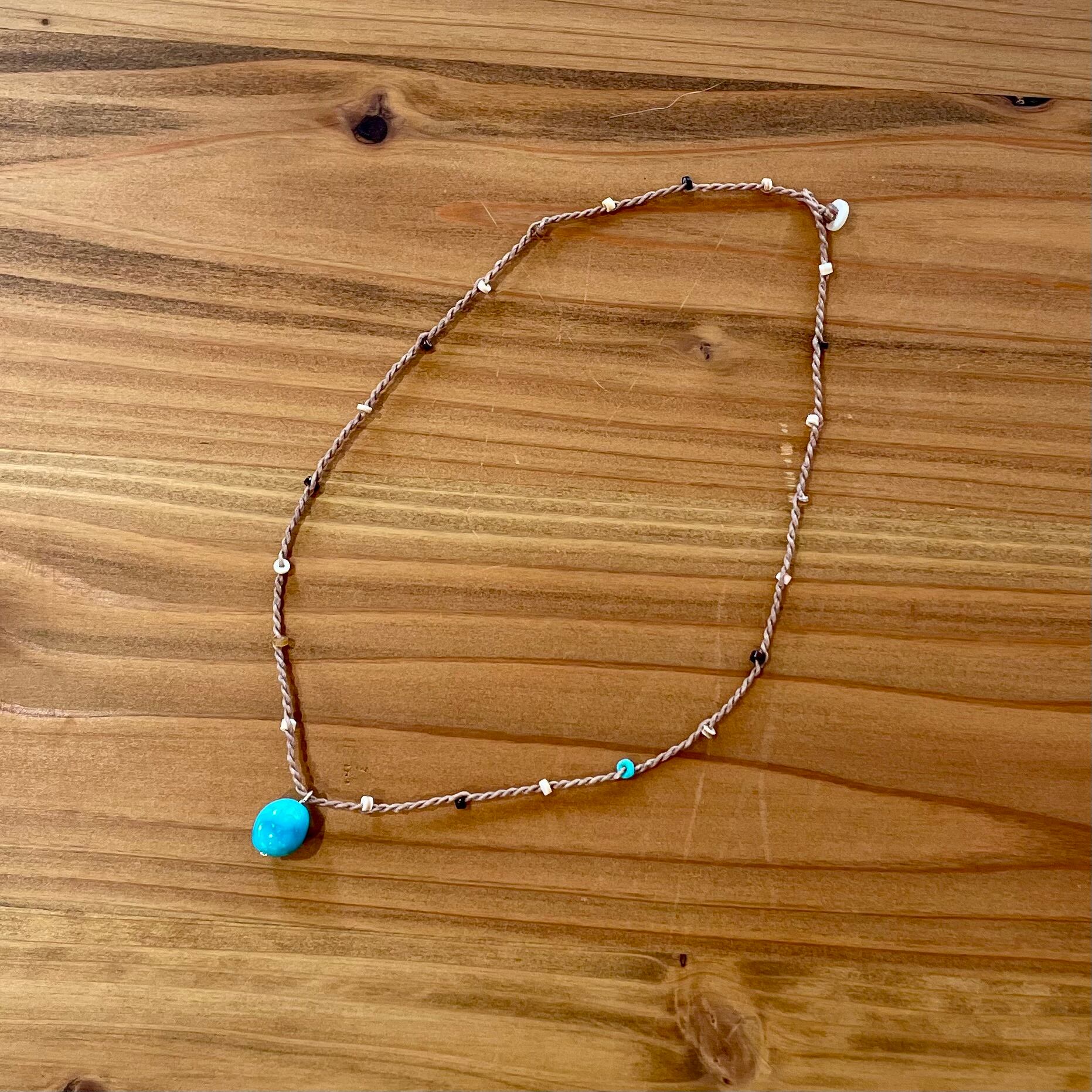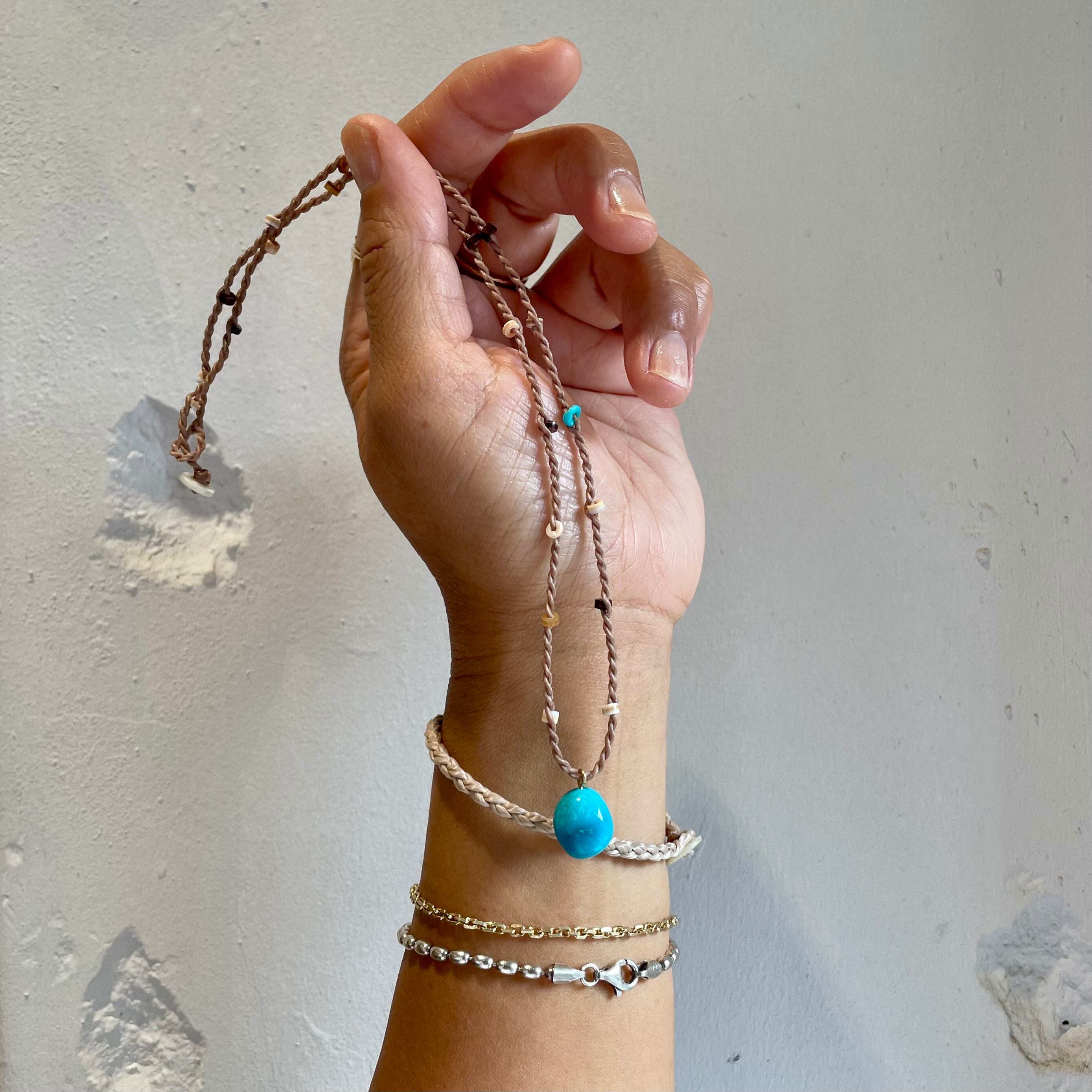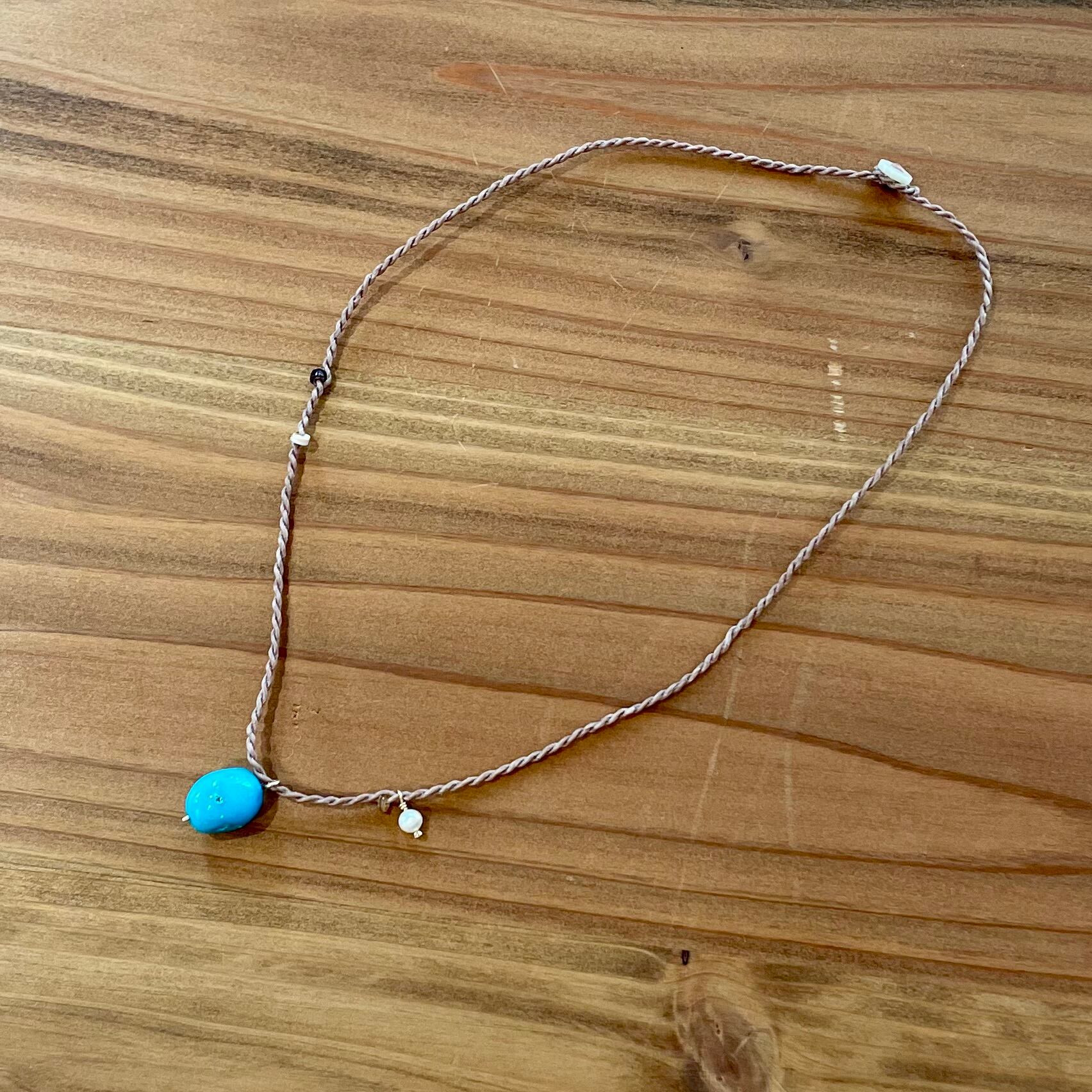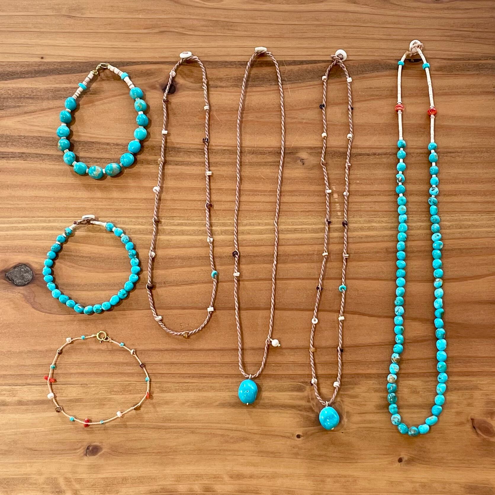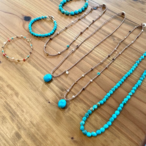 1950年代に採掘されたスリーピングビューティターコイズをポリエステルコードでロープネックレスに仕立てたネックレス2種です。ナチュラルでこの美しい色は本当に魅力的!ペンダントトップ単品としても定番で作っていますが、より繊細にシンプルなネックレスもまた力が抜けて大人カジュアルコーディネートにお勧めです。