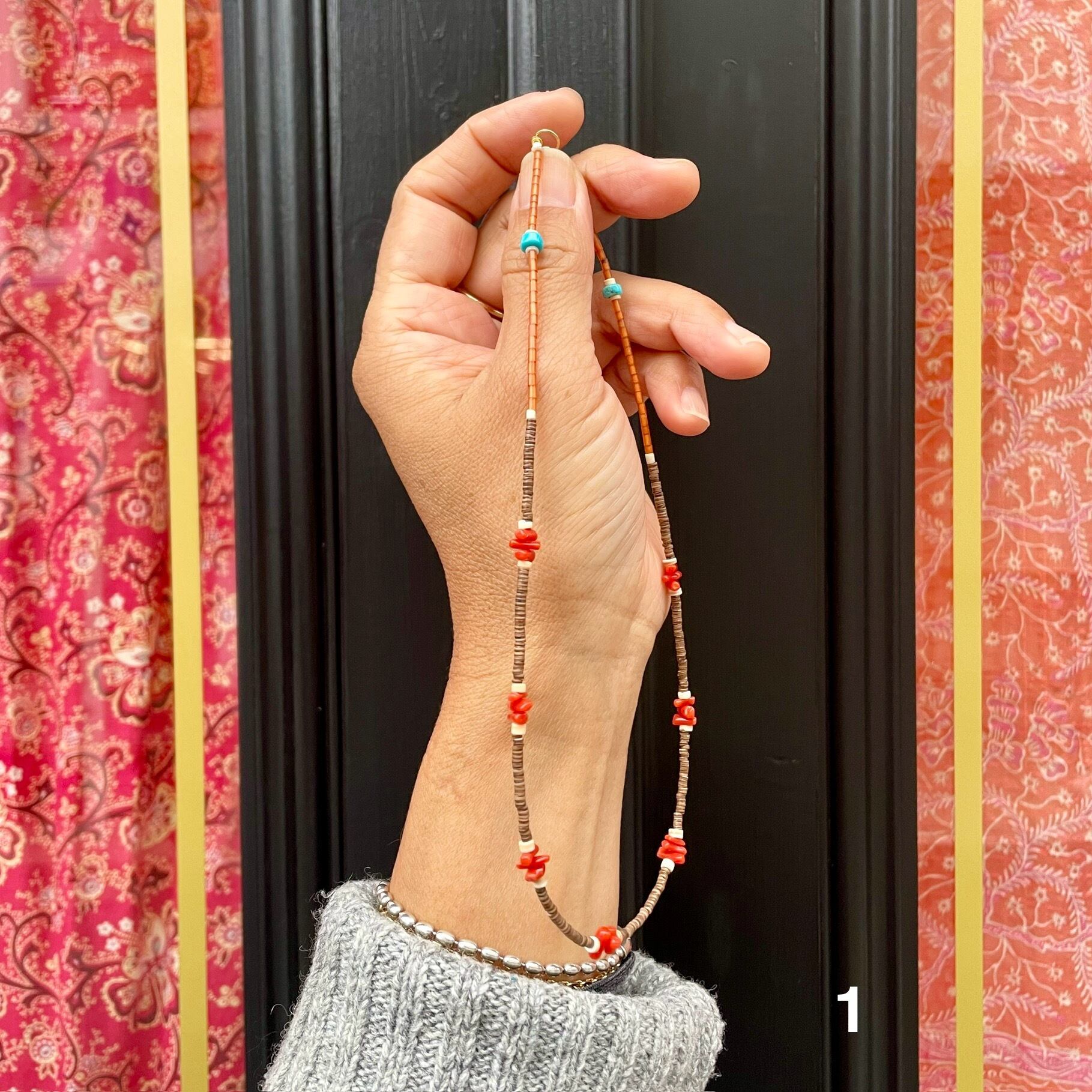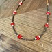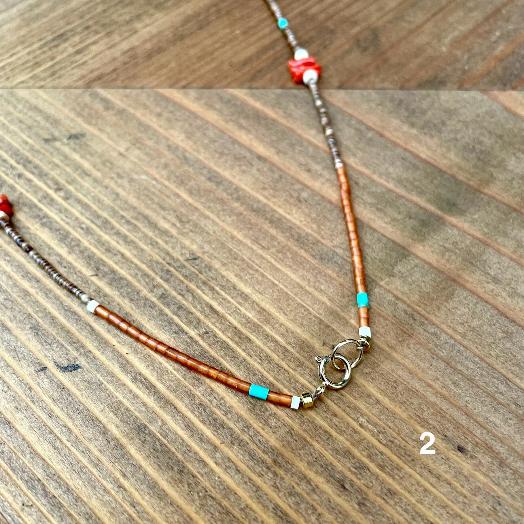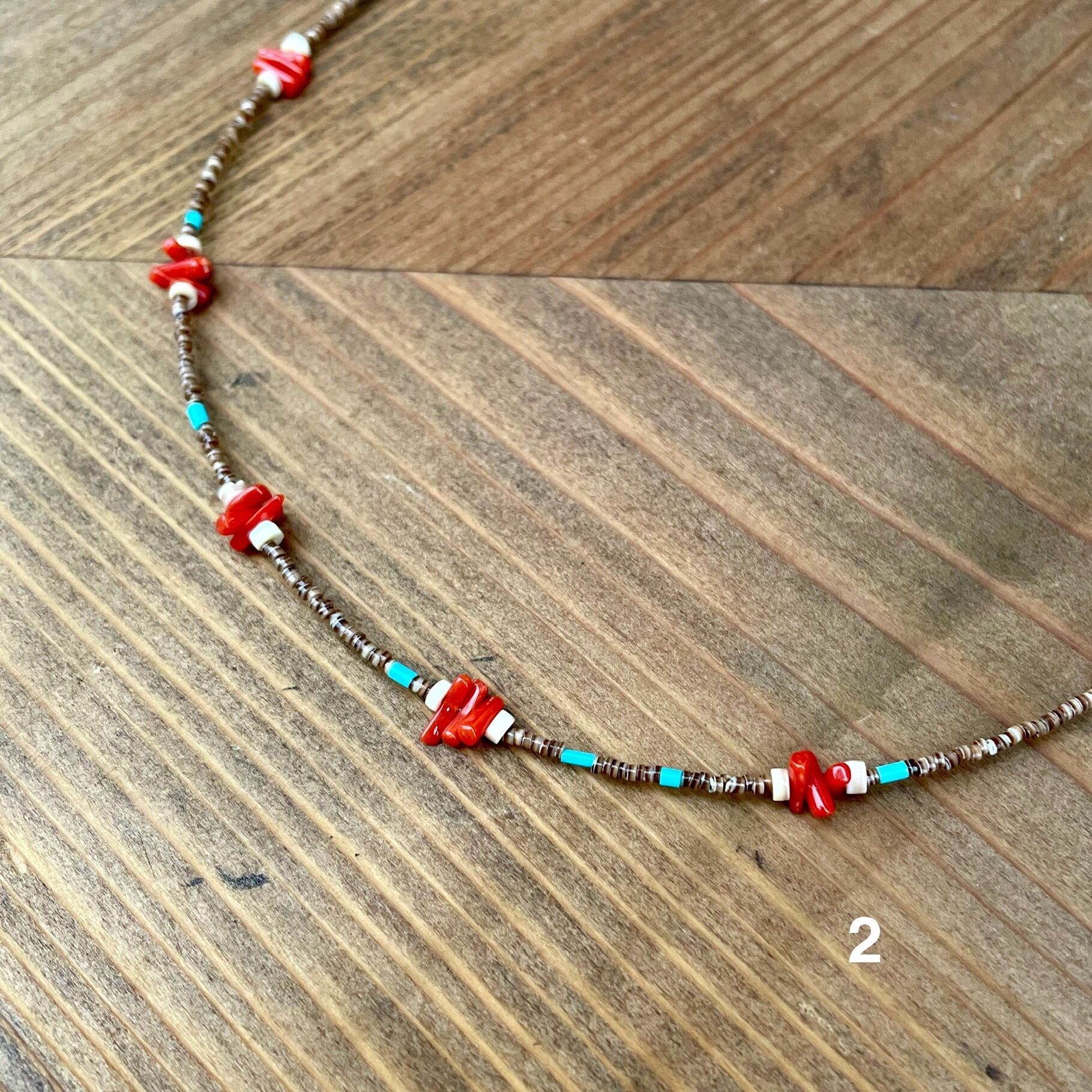 繊細なシェルのビーズと地中海珊瑚のネックレスです。どちらにも使用したブラウンシェルのビーズは最近では大変手に入りにくい細さのビーズで、ナチュラルな形の珊瑚を引き立ててくれています。