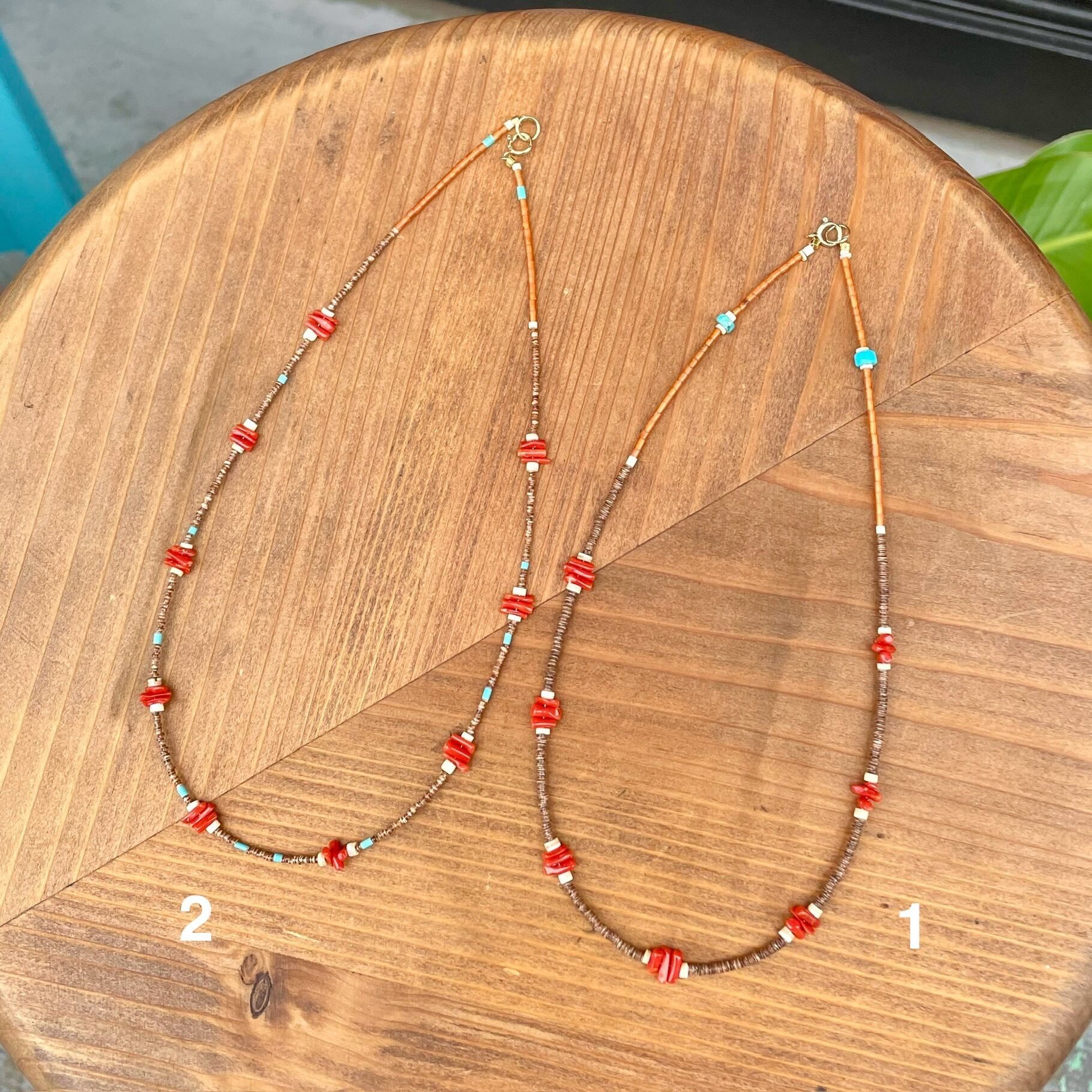 全体を落ち着いた雰囲気に仕上げていますので重ね付けにも役立ちそうです♪ 2本は少しデザインが異なりますのでよく見てくださいね。1はシェルが2mm程度で長さ40cm、2はシェルが1.5mm程度で長さ42cmです。