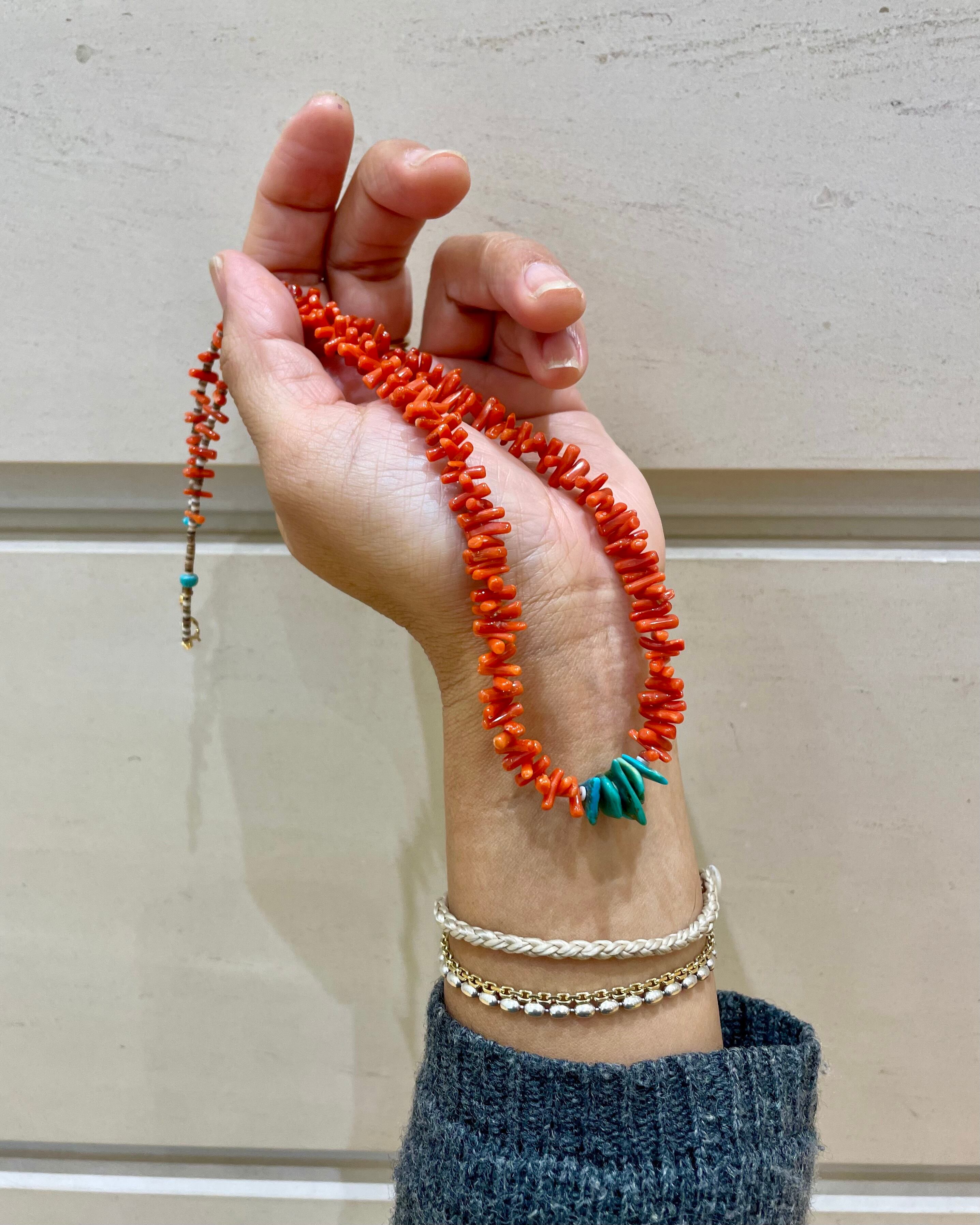 SOLD OUT華やかな朱赤の地中海珊瑚のネックレスができました。中心に施したのは24年前にカリフォルニアで仕入れたヴィンテージのネックレスを崩したビーズでその当時1930年代のネックレスだと聞かされました。ナバホ族のものだということでしたがこのターコイズがどこの鉱山のものかまでは確認できずじまい。生まれがわからないのですが新しい石にはない雰囲気が素敵で気に入っています。