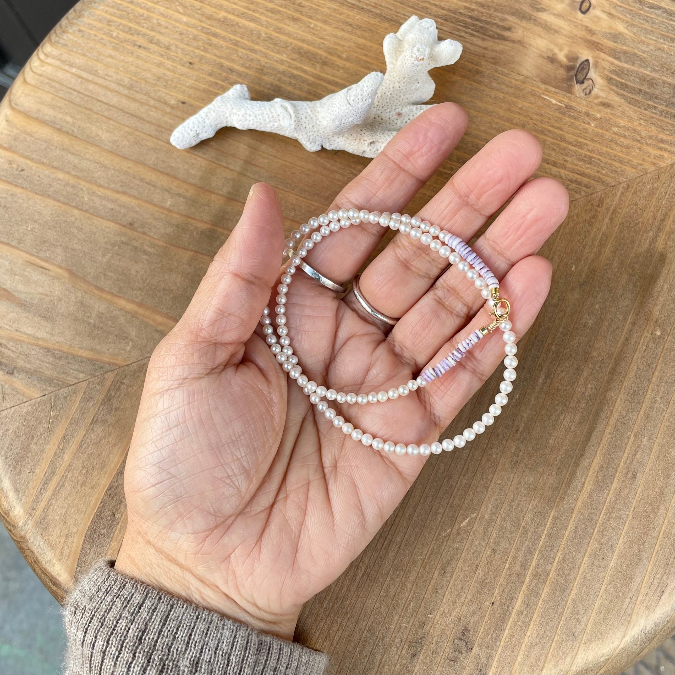 小粒な3mmのアコヤ真珠のシンプルなネックレスです。留め具の近くにナチュラルなラベンダーカラーのシェルヘイシビーズをアクセントにしました。ボリューム感としては「シルバーオーバルチェーン3mmの40cm」と近いので、写真2枚目,3枚目のようにペンダントトップを通しても素敵です。春のお祝いのシーンにも普段使いにも飽きずに使えそうなネックレスです。